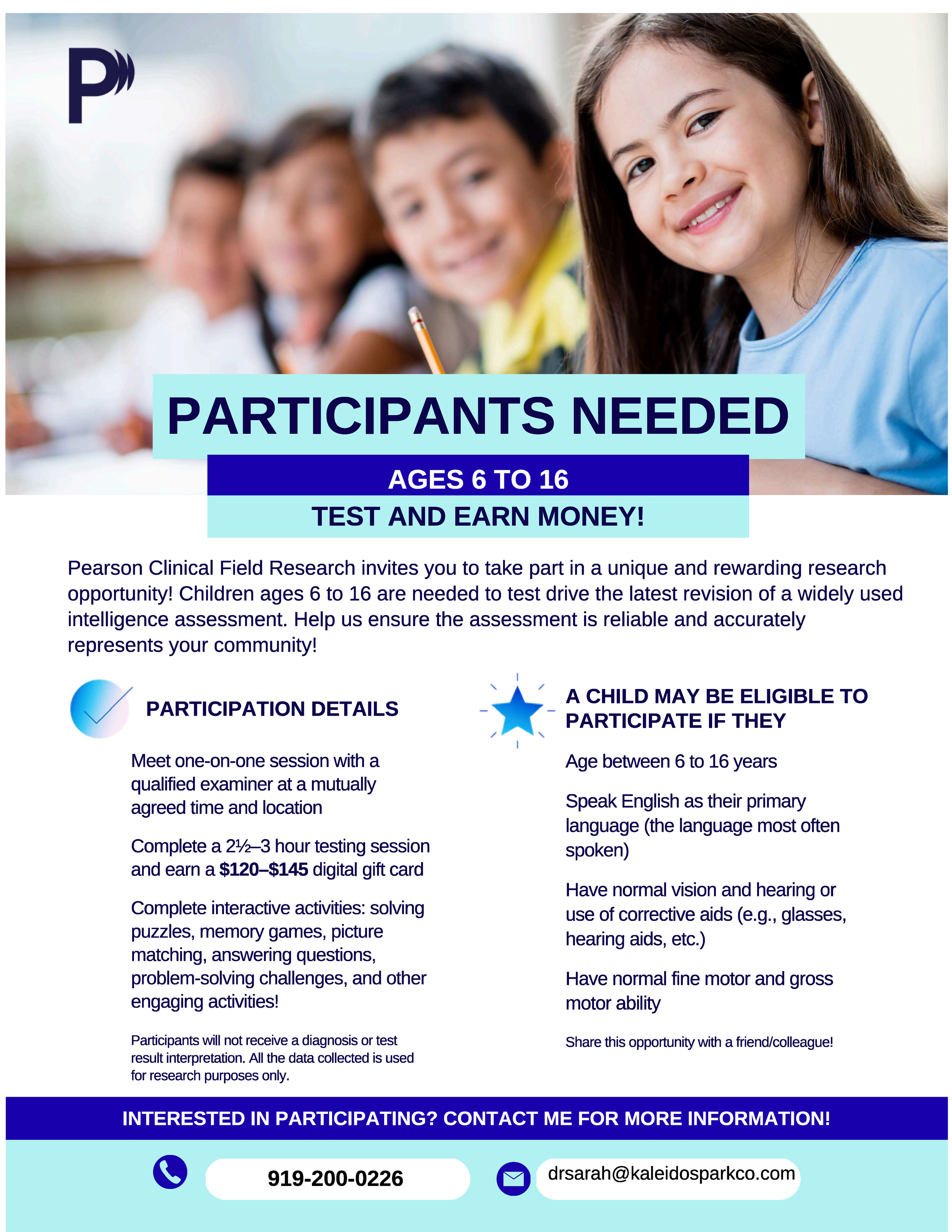 Eligibility criteria vary by study and may be based on age, background, or other research needs. Current projects often include children, adolescents, and young adults, with parent and teacher input when appropriate.